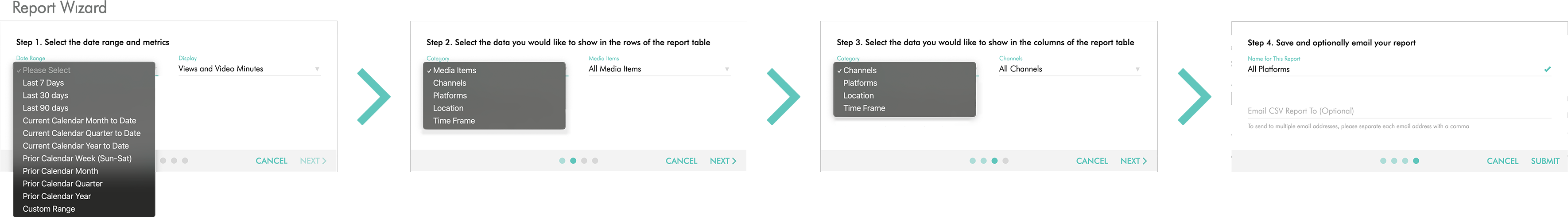 The Custom Report Builder, which is part of the Media Cloud Analytics Suite, allows you to create custom reports easier than ever before through the Report Wizard.