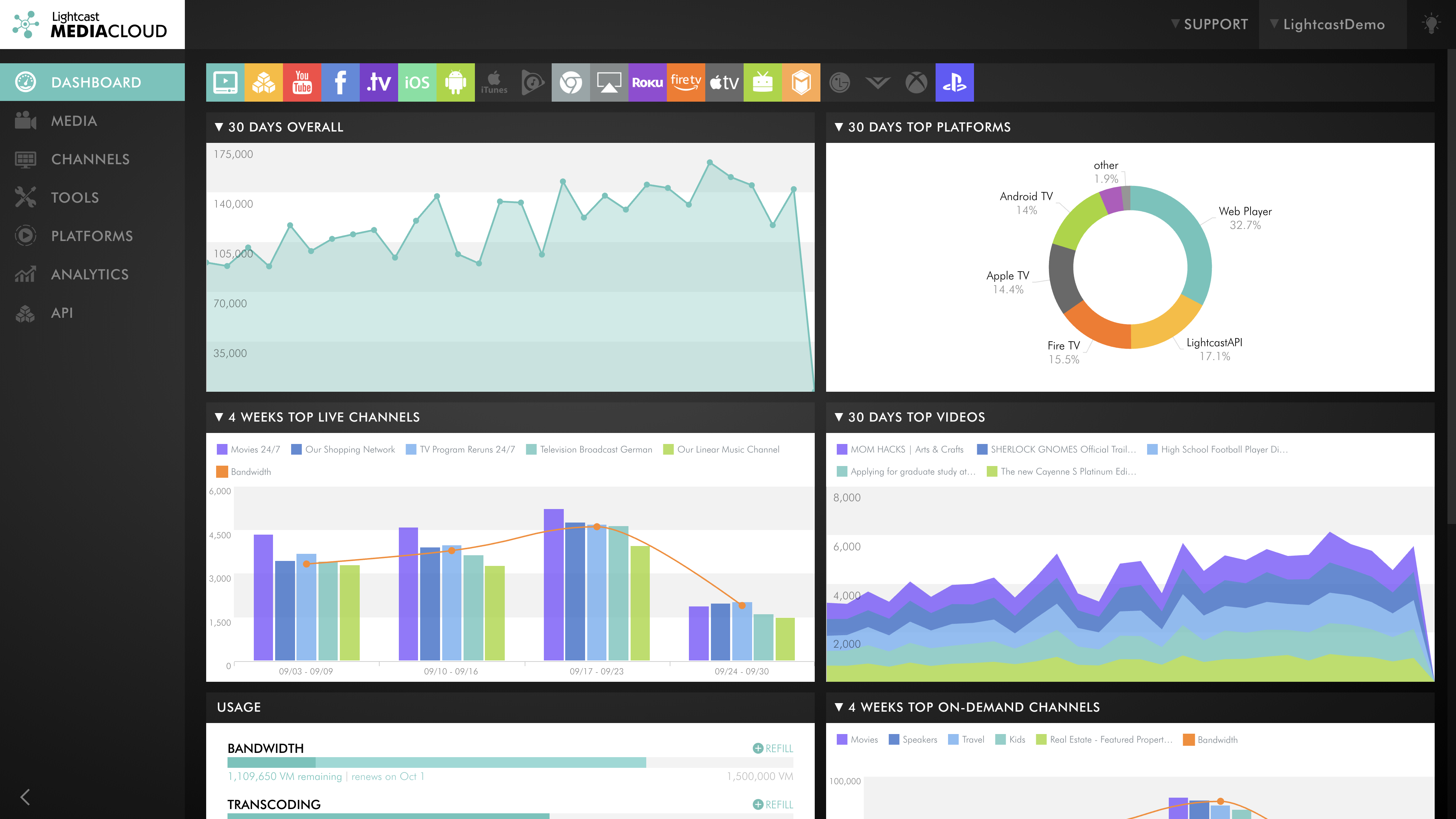 Make sure to sign in and use the Media Cloud regularly as new features will be released monthly, sometimes even weekly, including real-time app builders, new drag-and-drop schedulers for cloud-based payout of linear streams, new cloud-editing tools for live-recordings, more tools to manage your monetization setup, integration of the new analytics pro suite with behavioral data, subscriber activity tracking and in-depth data on your viewership.